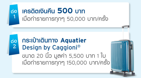 - ต่อที่ 2 กระเป๋าเดินทาง Aquatier Design by Caggioni ขนาด 20 นิ้ว มูลค่า 5,500 บาท 1 ใบ เมื่อทำรายการทุกๆ 150,000 บาท/ ครั้ง