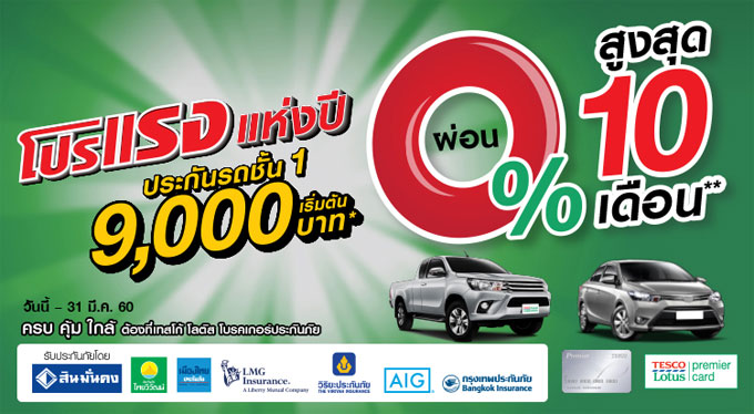โปรฯ แรงแห่งปี ประกันรถชั้น 1 เริ่มต้น 9,000 บาท ผ่อน 0% นานสูงสุด 10 เดือน ได้ที่เทสโก้ โลตัส เคาน์เตอร์บริการด้านการเงิน และโบรคเกอร์ประกันภัย วันนี้ - 31 มีนาคม 2560