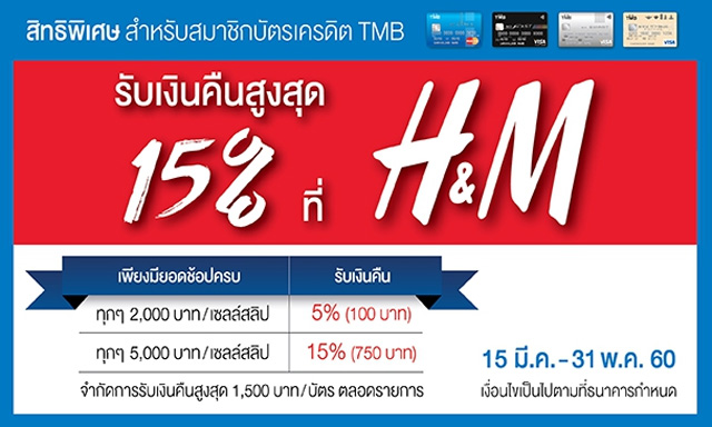 - เมื่อใช้จ่ายผ่านบัตรเครดิต TMB ครบทุกๆ 2,000 บาทขึ้นไป/ เซลล์สลิป รับเงินคืนเข้าบัญชีบัตรฯ 100 บาท ยอดใช้จ่ายครบทุกๆ 5,000 บาทขึ้นไป/ เซลล์สลิป รับเงินคืนเข้าบัญชีบัตร 750 บาท (รวมสูงสุด 1,500 บาท/ หมายเลขบัตร ตลอดรายการ) เมื่อใช้จ่ายผ่านบัตรฯ ที่ H&M ทุกสาขา ระหว่างวันที่ 15 มี.ค. - 31 พ.ค. 60 โดยยอดใช้จ่ายดังกล่าว ไม่รวม ยอดใช้จ่ายที่เกิดจากการซื้อบัตรของขวัญทุกประเภท ยอดใช้จ่ายในเชิงธุรกิจ ยอดใช้จ่ายที่ถูกยกเลิก และยอดใช้จ่ายที่มีการคืนสินค้าภายหลัง