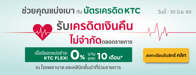 ช่วยคุณแบ่งเบา กับบัตรเครดิต KTC... รับเครดิตเงินคืนไม่จำกัด ตลอดรายการ เมื่อมียอดแบ่งชำระ KTC FLEXI 0% นานสูงสุด 10 เดือน ณ โรงพยาบาล และคลินิกชั้นนำที่ร่วมรายการ