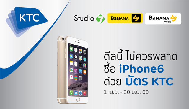 ดีลนี้ ไม่ควรพลาด!! ซื้อ iPhone 6 ด้วยบัตรเครดิต KTC แลกรับเครดิตเงินคืน 9% หรือแบ่งชำระ KTC FLEXI 0% นาน 6 เดือน เมื่อใช้จ่ายผ่านบัตรฯ และใช้คะแนนสะสม KTC Forever Rewards เพียงครึ่งหนึ่ง ของราคาสินค้า ณ ร้านค้าที่ร่วมรายการ อาทิ Studio 7, Banana และ Banana Mobile