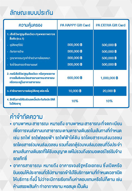 - สิทธิพิเศษที่ลูกค้าได้รับ มอบ Accident Care Card ซึ่งช่วยอำนวยความสะดวกในการเข้ารักษาการบาดเจ๊บ อันเนื่องมาจากอุบัติเหตุในโรงพยาบาลในเครือข่ายมากกว่า 300 แห่ง โดยที่ไม่ต้องสำรองจ่าย (ยกเว้นส่วนที่เกินจากวงเงินคุ้มครองจะต้องจ่ายเอง)