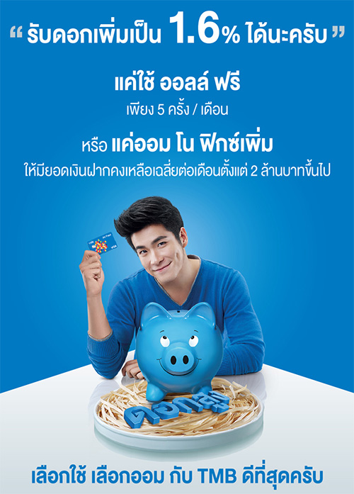 รับดอกเบี้ยเพิ่มเป็น 1.6% แค่ใช้บัญชีทีเอ็มบี ออลล์ ฟรี เพียง 5 ครั้ง / เดือน หรือ แค่ออมบัญชีทีเอ็มบี โน ฟิกซ์ ให้มียอดเงินฝากคงเหลือเฉลี่ยต่อเดือนตั้งแต่ 2 ล้านบาทขึ้นไป