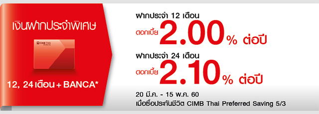 - ลูกค้าที่ซื้อผลิตภัณฑ์ของ CIMB Thai Preferred Saving 5/3 ของบริษัท อาคเนย์ประกันชีวิต จำกัด (มหาชน) มีสิทธิ์ฝากเงินตามโปรแกรมเงินฝากนี้ โดยที่ยอดเงินฝาก เท่ากับค่าเบี้ยเบี้ยประกันชีวิต ขั้นต่ำ 500,000 บาท ในปีแรกต่อรายการ (กรมธรรม์ประกันชีวิตที่ระบุข้างต้นที่ซื้อตั้งแต่วันที่ 20 มีนาคม - 30 เมษายน 2560 และได้รับอนุมัติภายในวันที่ 8 พฤษภาคม 2560 ทุกกรมธรรม์ มีสิทธิ์เข้าร่วมโปรแกรมเงินฝากนี้ โดยสามารถฝากเงินได้ตั้งแต่วันที่ 20 มีนาคม - 20 เมษายน 2560 หรือจนกว่าจะมีประกาศเปลี่ยนแปลง)