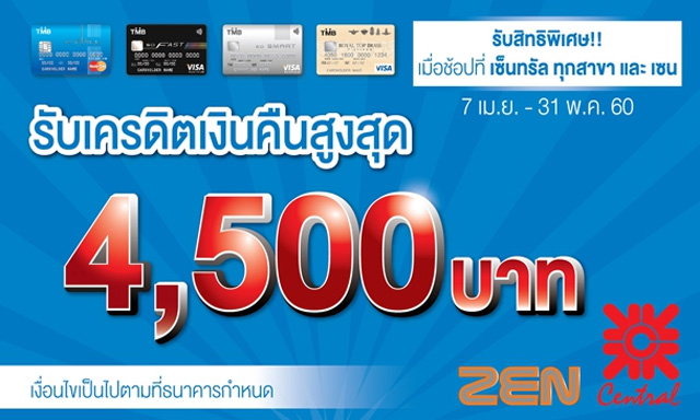 รับเครดิตเงินคืนสูงสุด 4,500 บาท เมื่อช้อปที่เซ็นทรัล ทุกสาขา และเซน ผ่านบัตรเครดิต TMB