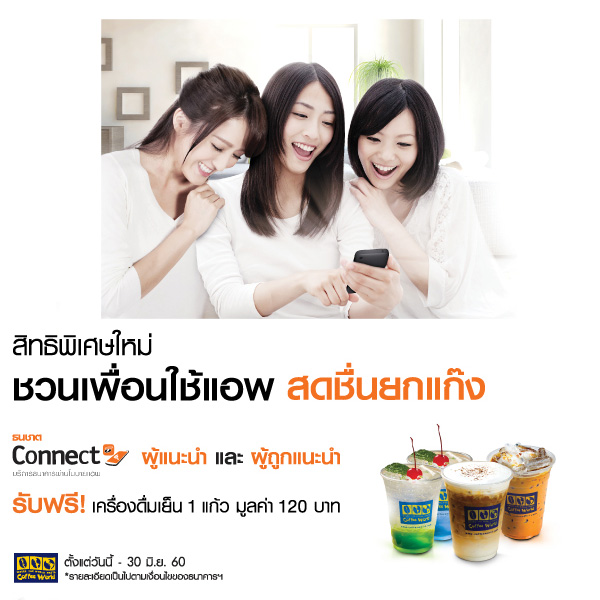 สิทธิพิเศษ ชวนเพื่อนใช้แอพ ธนชาต Connect วันนี้ ผู้แนะนำ และผู้ถูกแนะนำ รับฟรี เครื่องดื่มเย็นจาก Coffee World 1 แก้ว มูลค่า 120 บาท