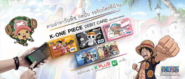บัตรเดบิตวันพีซกสิกรไทย (บัตรเดบิตลายพิเศษ) ร่วมตะลุยโลกใหม่ ตามล่าหาวันพีซ ถูกใจแฟนวันพีซ มี 5 ลายให้เลือก ทั้งลาย ลูฟี่/ ธง/ ช็อปเปอร์/ ลูฟี่ โซโร ซันจิ และ ลายรวมวันพีซ กดปั๊บ รอรับบัตรที่บ้าน สมัครได้แล้ววันนี้! ที่ แอปฯ K PLUS เท่านั้น