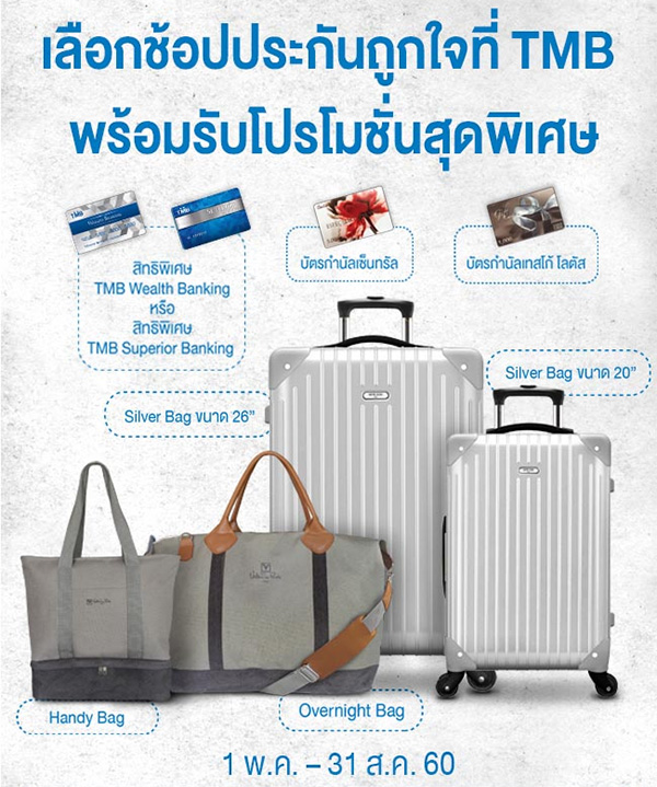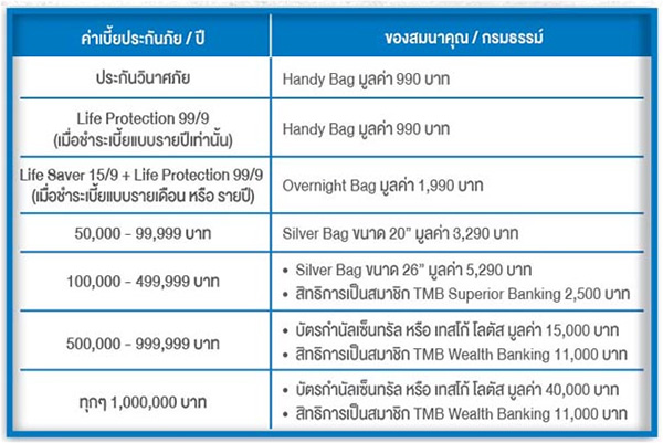 รายละเอียดเพิ่มเติม - สำหรับลูกค้าที่สมัครและชำระค่าเบี้ยประกันที่ร่วมโปรโมชั่น ได้แก่ Life Protection 99/9, TMB Smart Life 15/8, TMB Smart Life 10/7, TMB Kids Saving Plan (15/8), TMB Better Life 99/8 Plus, TMB For Life (85/60, 85/5), WL 99/5, TMB Wealthy Link, TMB Health Care, TMB Secure Life, TMB Motor Insurance, TMB Home Safe 100% Sure ยกเว้น TMB No Check Up 15/7 และ TMB Accident Care ตั้งแต่ 1 พฤษภาคม - 31 สิงหาคม 2560 โดยกรมธรรม์ต้องได้รับการอนุมัติภายในวันที่ 29 กันยายน 2560 และมีผลบังคับจนถึงวันที่รับของสมนาคุณ ขอสงวนสิทธิ์การรับของสมนาคุณ 1 ชิ้น ต่อ 1 กรมธรรม์ ไม่สามารถรวมค่าเบี้ยประกันได้ ทั้งนี้ สงวนสิทธิ์การเป็นสมาชิก TMB Superior Banking / TMB Wealth Banking 1 สิทธิ์ ต่อ 1 ท่าน