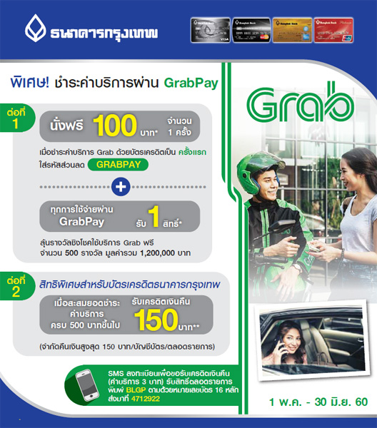 - ลูกค้าจะได้รับ 1 สิทธิ์ ต่อทุกๆ การชำระค่าบริการด้วย GrabPay เพื่อลุ้นรับรางวัลใช้บริการ Grab ฟรี มูลค่า 1.2 ล้านบาท รวม 500 รางวัล
