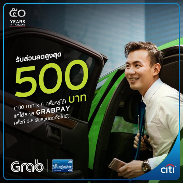 รับส่วนลดสูงสุด 500 บาท (100 บาท จำนวน 5 ครั้ง/ ผู้ใช้) เมื่อใช้บริการ Grab และชำระด้วยบัตรเครดิตซิตี้ เพียงใส่รหัส GRABPAY (ครั้งที่ 2 - 5 รับส่วนลดอัตโนมัติ)