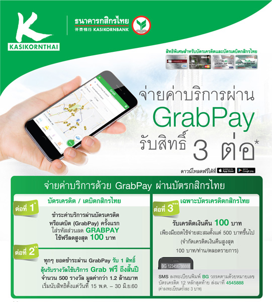 จ่ายค่าบริการผ่าน GrabPay ผ่านบัตรกสิกรไทย รับสิทธิ์ 3 ต่อ - ต่อที่ 1 ชำระค่าบริการผ่านบัตรเครดิตหรือบัตรเดบิต (GrabPay) ครั้งแรก ใส่รหัสส่วนลด GRABPAY ใช้ฟรีลดสูงสุด 100 บาท