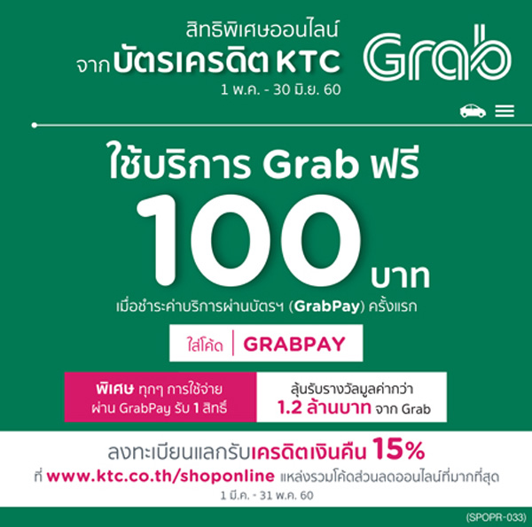 ใช้บริการ Grab ฟรี 100 บาท เมื่อชำระค่าบริการผ่านบัตรฯ (GrabPay) ครั้งแรก ใส่โค้ด GRABPAY พิเศษ! ทุกๆ การใช้จ่ายผ่าน grabPay รับ 1 สิทธิ์ ลุ้นรางวัลมูลค่ากว่า 1.2 ล้านบาท จาก Grab