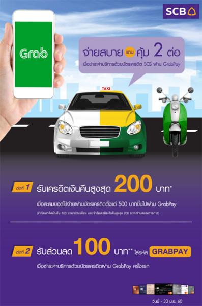 รับสิทธิ์ 3 ต่อ เมื่อชำระค่าบริการ Grab ด้วยบัตรเครดิตสแตนดาร์ดชาร์เตอร์ด (GrabPay) - ต่อที่ 1 ใช้ Grab ฟรี 100 บาท เมื่อชำระค่าบริการผ่าน GrabPay เป็นครั้งแรก ผ่านบัตรฯ พร้อมใส่โปรโมชั่นโค้ด GRABPAY