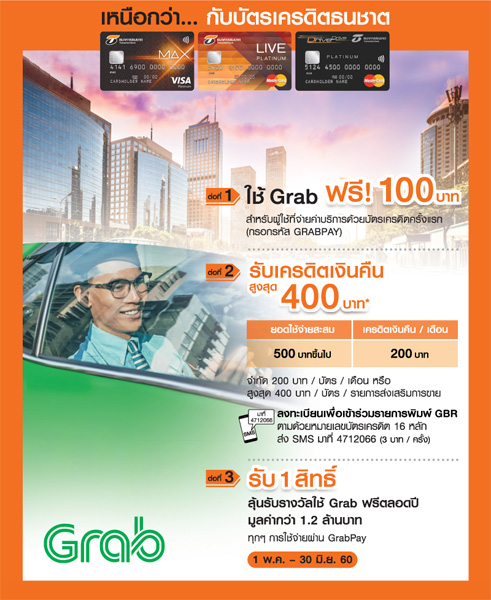 รับสิทธิ์ 3 ต่อ เมื่อใช้บัตรเครดิตธนชาต จ่ายค่าบริการ Grab - ต่อที่ 1 ใช้ Grab ฟรี 100 บาท สำหรับผู้ใช้จ่ายบริการด้วยบัตรเครดิตครั้งแรก (กรอกรหัส GRABPAY)