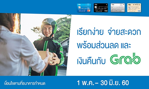 ลูกค้าบัตรเครดิต TMB เรียกง่าย จ่ายสะดวก พร้อมส่วนลดและเงินคืน กับ Grab - รับส่วนลด 100 บาท เมื่อชำระค่าบริการผ่านบัตรเครดิตครั้งแรก กรอกรหัสส่วนลด GRABPAY (สิทธิพิเศษนี้สามารถใช้ได้ทั้งบัตรเครดิตและบัตรเดบิต)