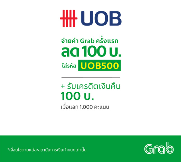 รับเงินคืน 5%* เมื่อมียอดใช้สะสมครบทุกๆ 500 บาท/ เดือน ผ่านบริการ GrabPay - ต่อที่ 3 ลุ้นรับรางวัลใช้บริการ Grab ฟรี มูลค่า 1.2 ล้านบาท รวม 500 รางวัล