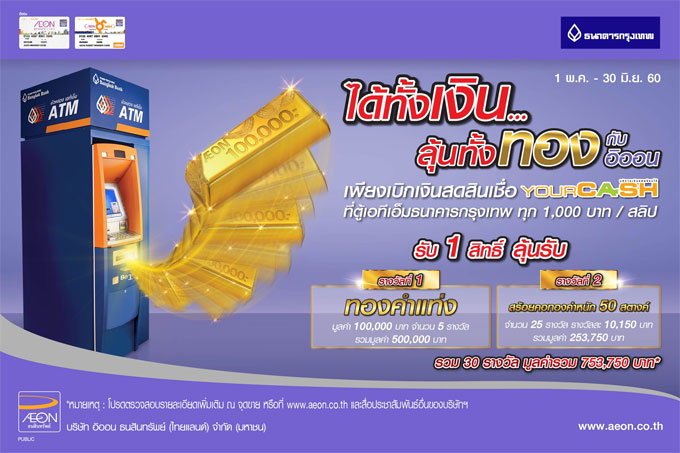 ได้ทั้งเงิน...ลุ้นทั้งทอง กับอิออน เพียงเบิกเงินสดสินเชื่อ YourCash ที่ตู้ ATM ธ.กรุงเทพ