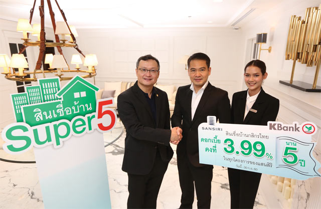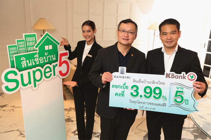 นายบุนชาน กุลวทัญญู ผู้ช่วยกรรมการผู้จัดการ ธนาคารกสิกรไทย และนายอุทัย อุทัยแสงสุข รองกรรมการผู้จัดการอาวุโส สายงานพัฒนาธุรกิจและพัฒนาโครงการคอนโดมิเนียม บริษัท แสนสิริ จำกัด (มหาชน) เปิดตัวแคมเปญ "Super Five" สำหรับลูกค้าที่ใช้บริการสินเชื่อบ้านกสิกรไทย เพื่อซื้อบ้าน คอนโดฯ ทาวน์เฮ้าส์ พร้อมอยู่ของแสนสิริทั่วประเทศที่ร่วมรายการ รับอัตราดอกเบี้ยพิเศษคงที่ 3.99% นานที่สุดถึง 5 ปี สำหรับลูกค้าที่สมัครและทำสัญญาจดจำนอง ตั้งแต่วันนี้ - 30 ก.ย. 60 เงื่อนไขเป็นไปตามที่ธนาคารและแสนสิริกำหนด สอบถามรายละเอียดเพิ่มเติมได้ที่ธนาคารกสิกรไทยทุกสาขา
