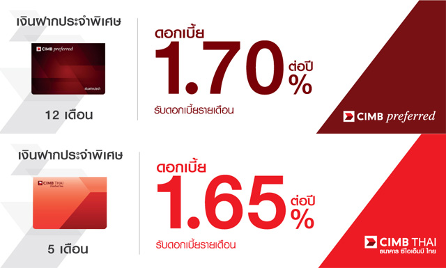 บัญชีเงินฝากประจำพิเศษ 12 เดือน อัตราดอกเบี้ย 1.70% ต่อปี สำหรับลูกค้า CIMB Preferred