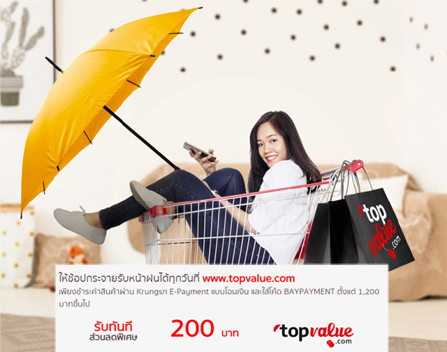 ธนาคารกรุงศรีอยุธยา ให้คุณช้อปกระจายรับหน้าฝนได้ทุกวันที่ www.topvalue.com เพียงชำระค่าสินค้าผ่าน Krungsri E-Payment แบบโอนเงิน และใส่โค้ด BAYPAYMENT ตั้งแต่ 1,200 บาทขึ้นไป รับทันที่ ส่วนลดพิเศษ 200 บาท
