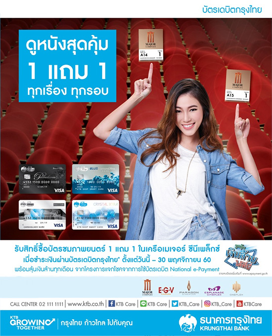 รับสิทธิ์ซื้อบัตรชมภาพยนตร์ 1 แถม 1 ในเครือเมเจอร์ ซีนีเพล็กซ์ เมื่อชำระเงินผ่านบัตรเดบิตกรุงไทย พร้อมลุ้นเงินล้านทุกเดือนจากโครงการแจกโชคจากการใช้บัตรเดบิต National e-Payment