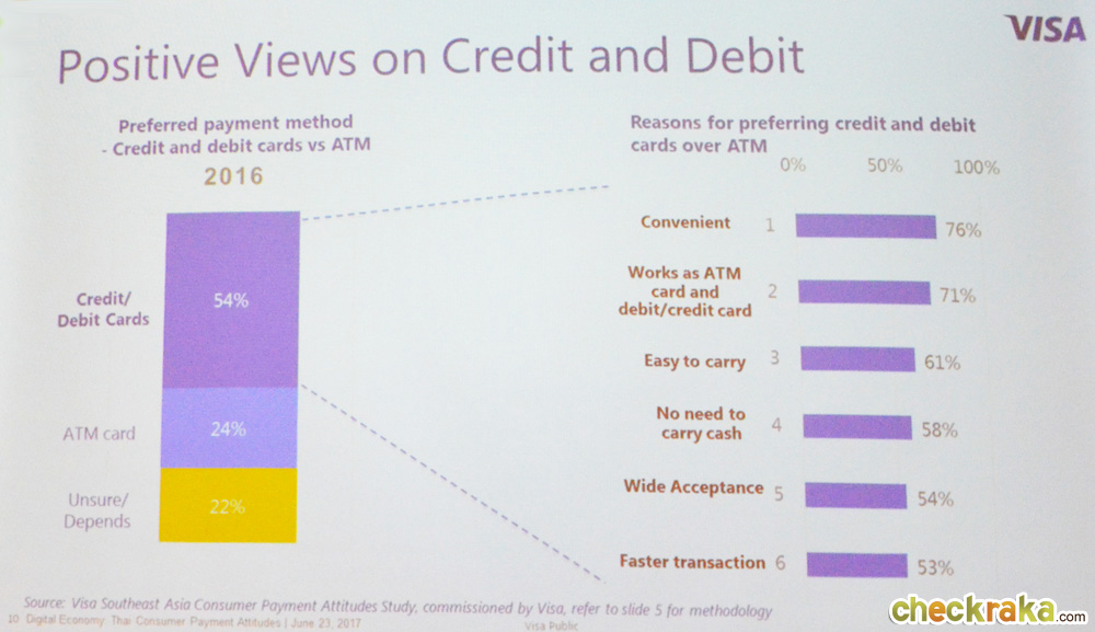 ผลสำรวจครั้งที่ 3 ของการสำรวจเกี่ยวกับการศึกษาเรื่องทัศนคติในการชำระเงินของผู้บริโภค ประจำปี 2559 ได้เจาะลึกถึงทัศนคติของผู้บริโภคในปัจจุบันเกี่ยวกับการชำระเงินในรูปแบบ Electronic และสำรวจเทรนด์พฤติกรรมของผู้บริโภคจาก 6 ประเทศในเอเชียตะวันออกเฉียงใต้ ได้แก่ อินโดนีเซีย มาเลเซีย ฟิลิปปินส์ สิงคโปร์ ไทย และเวียดนาม โดยมีผู้ร่วมทำแบบสอบถามทั้งหมด 1,000 ราย เป็นผู้ตอบแบบสอบถามคนไทยทั้งหมด 500 ราย เป็นพนักงานอายุตั้งแต่ 18 ปีขึ้นไป มีรายได้เฉลี่ยต่อคนมากกว่า 15,000 บาทต่อเดือน ซึ่งเป็นการทำแบบสอบถามออนไลน์ พบว่าหนึ่งในผลสำรวจเกี่ยวกับประเทศไทยชี้ให้เห็นว่า 73% นั้นชำระเงินแบบอิเล็กทรอนิกส์ ไม่ว่าจะเป็นการชำระเงินผ่านบัตร อุปกรณ์เคลื่อนที่ต่างๆ อย่างสมาร์ทโฟน และอุปกรณ์สวมใส่ มากกว่าการชำระผ่านเงินสด แสดงให้เห็นถึงการเลี่ยงใช้การใช้เศษเหรียญและธนบัตรอย่างจริงจัง หรือเรียกได้ว่าแทบจะเป็น Cashless society เลยก็ว่าได้ เหตุก็เนื่องมาจากเรื่องของความปลอดภัยและความไม่สะดวกในการพกเงินสดเอาไว้มากๆ ในกระเป๋าสตางค์นั่นเอง