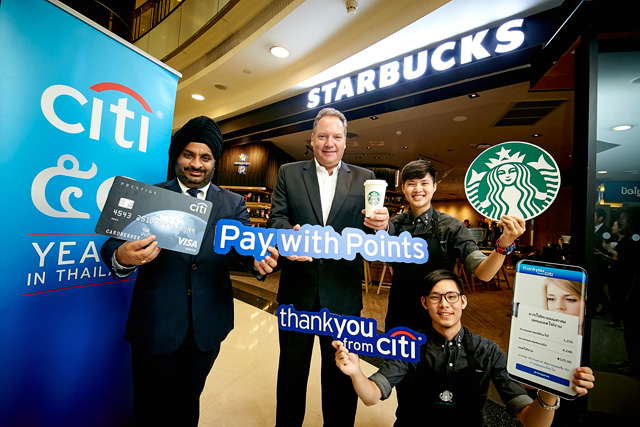 เพื่อมอบความเพลิดเพลินให้กับไลฟ์สไตล์ได้มากกว่าที่เคย พร้อมรับสิทธิประโยชน์และข้อเสนอดีๆ มากมายจากโปรแกรมแลกคะแนนสะสมสุดคุ้มค่า ซึ่งเป็นครั้งแรกกับการร่วมมือระหว่าง ซิตี้แบงก์ ประเทศไทย ผู้นำด้านนวัตกรรมแห่งวงการบัตรเครดิต ร่วมมือกับ สตาร์บัคส์ แบรนด์ร้านกาแฟระดับโลก เปิดตัวโปรแกรม "Pay with Points แลกคะแนนสะสม แทนยอดใช้จ่ายบัตรเครดิตที่สตาร์บัคส์" โดยมี มร. ซานดีพ บาตระ ผู้ช่วยรองกรรมการผู้จัดการใหญ่ ฝ่ายธุรกิจบัตรเครดิตและสินเชื่อบุคคล ธนาคารซิตี้แบงก์ ประเทศไทย และ มร.เมอร์เรย์ ดาร์ลิง กรรมการผู้จัดการ บริษัท สตาร์บัคส์ คอฟฟี่ (ประเทศไทย) จำกัด ร่วมกันแนะนำโปรแกรมดังกล่าวซึ่งเป็นส่วนหนึ่งของโปรแกรมแลกคะแนนสะสม Citi ThankYou Rewards ที่มุ่งตอบสนองไลฟ์สไตล์คนรุ่นใหม่ เพิ่มช่องทางการแลกคะแนนสะสมผ่านโทรศัพท์มือถือ ที่สะดวกและรวดเร็วมากยิ่งขึ้น พร้อมสิทธิประโยชน์จากคะแนนสะสมที่ให้มูลค่ามากกว่าที่คิด