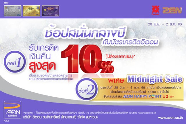 จัดขึ้นแล้ววันนี้! กับงาน MIDNIGHT SALE 2017 ที่บัตรเครดิตชั้นนำ ได้ร่วมจัดโปรโมชั่น ณ ห้างสรรพสินค้าที่ร่วมรายการ อาทิ เซ็นทรัลทุกสาขาและเซน เดอะมอลล์ เอ็มโพเรียม เอ็มควอเทียร์ พารากอน และบลูพอร์ต หัวหิน โดยผู้ถือบัตรจะได้รับทั้งส่วนลดและเครดิตเงินคืนมากมาย ระยะเวลาโปรโมชั่นของแต่ละห้างฯ จะแตกต่างกันไป โดยที่เครือเดอะมอลล์จะสิ้นสุดในวันที่ 2 ก.ค. 60 ส่วนในเครือเซ็นทรัลจะสิ้นสุดในวันที่ 5 ก.ค. 60 นี้ รีบๆ ไปดูโปรโมชั่นกันดีกว่าค่ะ