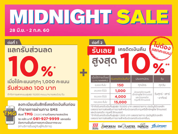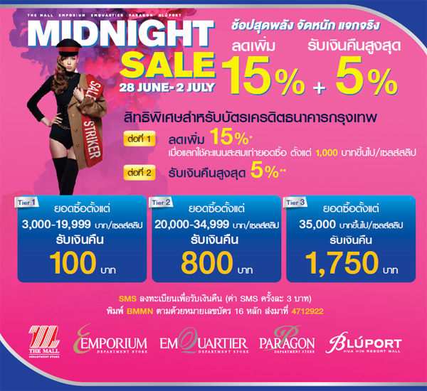 รายละเอียดโปรโมชั่น : MIDNIGHT SALE รับเงินคืน 15% ใช้คะแนนสะสมเท่ากับยอดซื้อสินค้าแลกรับเครดิตเงินคืนภายในวัน เมื่อใช้จ่ายตั้งแต่ 2,000 บาทขึ้นไป/ เซลล์สลิป เมื่อช้อปที่เดอะมอลล์ทุกสาขา, เอ็มโพเรียม, เอ็มควอเทียร์, พารากอน และบลูพอร์ต