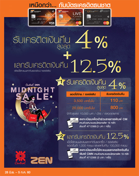 รายละเอียดโปรโมชั่น 2 : รับเงินคืนสูงสุด 3,000 บาท เพียงสะสมยอดช้อปที่เซ็นทรัลทุกสาขาและเซน ในงาน Central Midnight Sale (สูงสุด 3,000 บาท/ บัตร ตลอดรายการ)