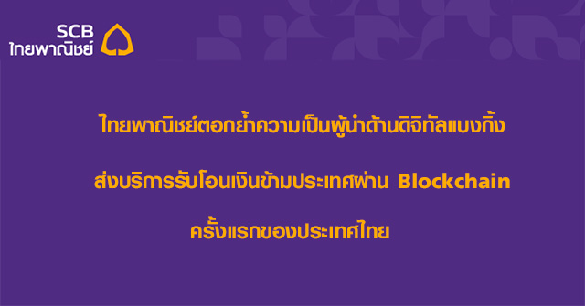 ธนาคารไทยพาณิชย์ ผนึก Ripple และ SBI Remit จากประเทศญี่ปุ่น ต่อยอดความก้าวหน้าทางด้านนวัตกรรมทางการเงิน ประสบความสำเร็จนำเทคโนโลยี บล็อกเชน (Blockchain) ยกระดับการให้บริการรับโอนเงินข้ามประเทศแบบเรียลไทม์สำหรับลูกค้ารายย่อยเป็นครั้งแรกของประเทศไทย ความก้าวหน้าครั้งสำคัญของการสร้างระบบนิเวศทางการเงินยุคใหม่ที่มีประสิทธิภาพ รวดเร็ว และปลอดภัยมากยิ่งขึ้น ตอบสนองเทรนด์ผู้บริโภคยุคใหม่สู่โลกการเงินดิจิทัลอย่างเต็มรูปแบบ พร้อมนำร่องให้บริการต้นแบบครั้งแรกด้วยบริการโอนเงินข้ามประเทศจากประเทศญี่ปุ่น มายังบัญชีธนาคารไทยพาณิชย์ในประเทศไทยโดยตรง เริ่มตั้งแต่วันนี้ เป็นต้นไป พร้อมเตรียมเปิดบริการครอบคลุมกลุ่มประเทศในทวีปอเมริกาเหนือ ยุโรป และเอเชียแปซิฟิก ต่อไป