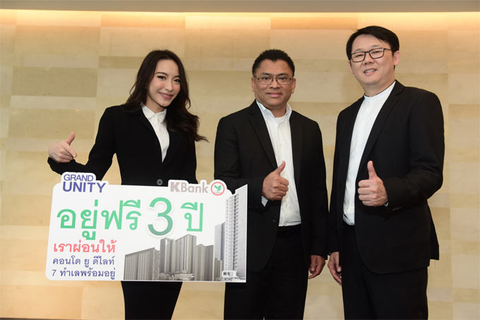 นายอลงกต บุญมาสุข (กลาง) ผู้อำนวยการฝ่ายอาวุโส ฝ่ายบริหารผลิตภัณฑ์สินเชื่อเพื่อที่อยู่อาศัยและสินเชื่อธุรกิจขนาดย่อม ธนาคารกสิกรไทย และนายสิริพงศ์ ศรีสว่างวงศ์ (ขวา) กรรมการผู้จัดการ บริษัท แกรนด์ ยูนิตี้ ดิเวลล็อปเมนท์ จำกัด ร่วมเปิดตัวแคมเปญ "แช่แข็งเงินผ่อน" มอบสิทธิพิเศษสำหรับลูกค้าสินเชื่อบ้านกสิกรไทยที่ซื้อคอนโดมิเนียม ยู ดีไลท์ ของแกรนด์ ยูนิตี้ 7 โครงการสามารถเข้าอยู่โดยไม่ต้องผ่อนชำระสินเชื่อบ้านนาน 3 ปี สำหรับลูกค้าที่สมัครและทำสัญญาจดจำนอง ตั้งแต่วันนี้ - 31 กรกฎาคม 2560