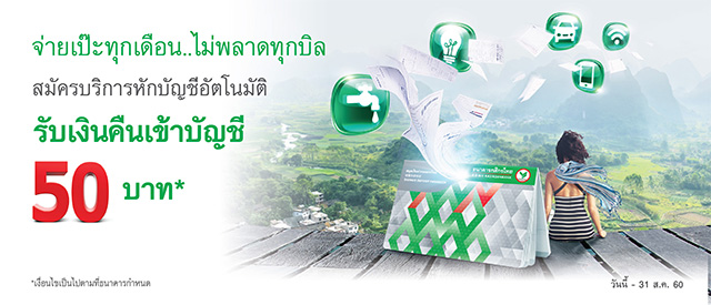 สมัครบริการหักบัญชีอัตโนมัติกับ ธ.กสิกรไทย วันนี้ รับเงินคืนเข้าบัญชี 50 บาท*