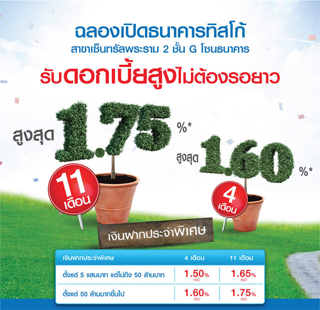 ฉลองเปิดธนาคารทิสโก้ สาขาเซ็นทรัลพระราม 2 รับดอกเบี้ยสูงไม่ต้องรอยาว พร้อมรับของสมนาคุณฟรี! กับบัญชีเงินฝากประจำพิเศษ ระยะเวลาฝาก 4 เดือน และ 11 เดือน