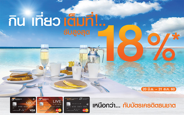 กิน เที่ยว เต็มที่! รับสูงสุด 18% เมื่อมียอดใช้จ่าย ณ ร้านค้าชั้นนำ ผ่านบัตรเครดิตธนชาต