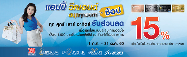 Happy Weekend ช้อปสนุกทุกองศา รับส่วนลด 15% ในวันศุกร์ เสาร์ อาทิตย์ ที่เดอะมอลล์ ทุกสาขา, เอ็มโพเรียม, เอ็มควอเทียร์, พารากอน และบลูพอร์ต เมื่อแลกคะแนนสะสมเท่ายอดซื้อตั้งแต่ 1,000 บาทขึ้นไป/ เซลล์สลิป