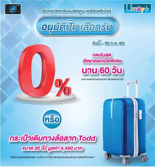 สมัครบัตรกดเงินสดยูเมะพลัส พรีเมียร์ เลือกรับอัตราดอกเบี้ยพิเศษ หรือกระเป๋าเดินทางล้อลาก Todd