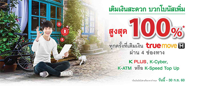 เติมเงิน truemoveH ผ่าน 4 ช่องทางของธนาคารกสิกรไทย เติมสะดวก รับโบนัสเพิ่มสูงสุด 100%*