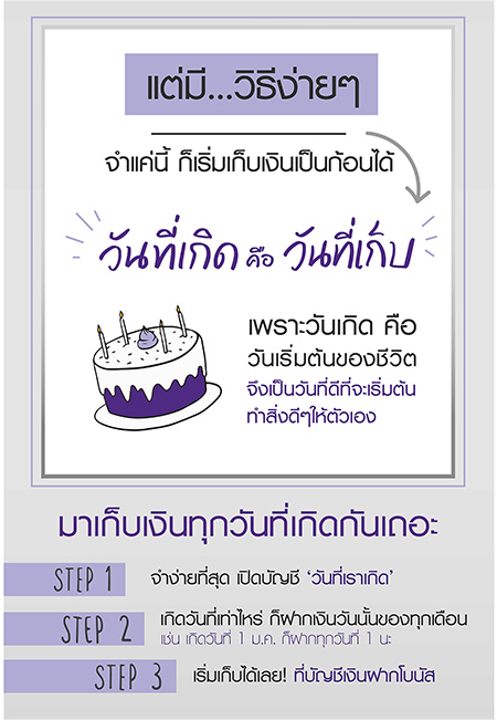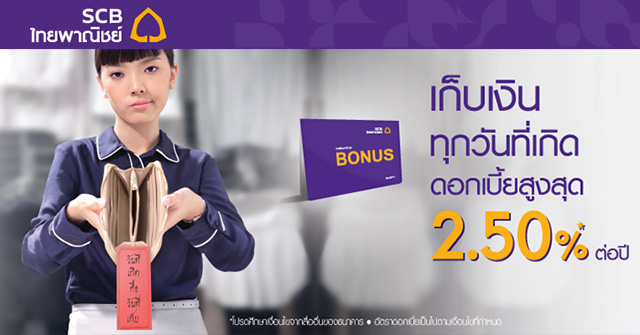 เก็บเงินทุกวันที่เกิดกับธนาคารไทยพาณิชย์ด้วยบัญชีเงินฝากโบนัส สามารถเลือกฝากได้ทั้งแบบ 24 เดือน และ 36 เดือน รับดอกเบี้ยสูง 2.25%* ต่อปี หรือ 2.50%*ต่อปี กับเงินฝากเริ่มต้นเพียง 500 บาท/เดือน และไม่ต้องเสียภาษีดอกเบี้ยเงินฝาก พร้อมมี SMS ช่วยเตือนทุกเดือน เพื่อสร้างวินัยในการออม