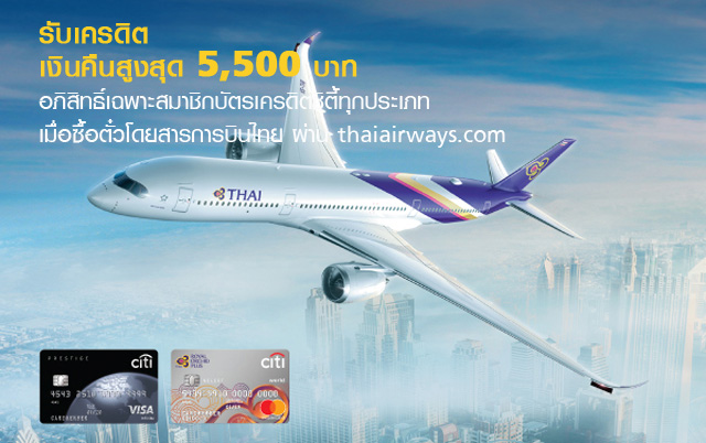 รับเครดิตเงินคืนสูงสุด 5,500 บาท เมื่อซื้อบัตรโดยสารการบินไทย ผ่าน thaiairways.com ด้วยบัตรเครดิตซิตี้