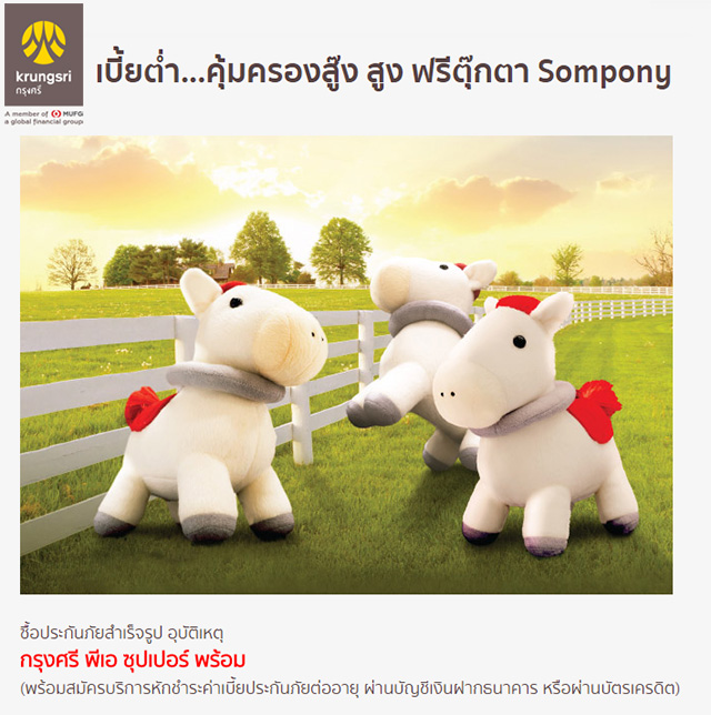 ซื้อประกันภัยสำเร็จรูป อุบัติเหตุ กรุงศรี พีเอ ซุปเปอร์ พร้อม (พร้อมสมัครบริการหักชำระค่าเบี้ยประกันภัยต่ออายุ ผ่านบัญชีเงินฝากธนาคาร หรือผ่านบัตรเครดิต) รับฟรี! ตุ๊กตา Sompony 1 ตัว มูลค่า 399 บาท