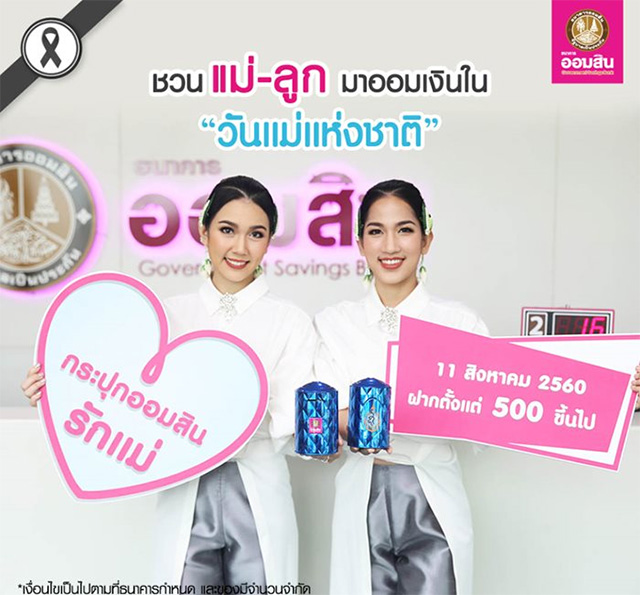 ธนาคารออมสินขอเชิญชวนแม่-ลูก ออมเงินเนื่องใน "วันแม่แห่งชาติ 2560" กับเงินฝากประเภทเผื่อเรียกทั้งที่เปิดบัญชีใหม่หรือฝากเพิ่มตั้งแต่ 500 บาทขึ้นไป โดยจะได้รับแจก "กระปุกออมสินเฉลิมพระเกียรติ สมเด็จพระนางเจ้าสิริกิติ์ พระบรมราชินีนาถ ในพระบาทสมเด็จพระปรมินทรมหาภูมิพลอดุลยเดช บรมนาถบพิตร" ซึ่งรับฝากเงินในวันศุกร์ที่ 11 สิงหาคม 2560 วันเดียวเท่านั้น เพียงแสดงบัตรประชาชนและทะเบียนบ้าน โดยจะได้รับคูปองเพื่อนำมาแลกรับกระปุกได้ตั้งแต่วันที่ 11 กันยายน - 31 ตุลาคม 2560 ซึ่งแม่มากับลูกและต่างฝากเงินเข้าบัญชีของตัวเองจะได้สิทธิ์รับคนละ 1 ใบ แม่มาคนเดียวได้สิทธิ์รับ 1 ใบ แต่หากลูกมาฝากเพียงผู้เดียวจะไม่ได้รับของแจกนี้ ทั้งนี้ธนาคารฯ ไม่จำกัดจำนวนลูกและอายุของลูก โดยติดต่อฝากเงินได้ที่ธนาคารออมสินทุกสาขาทั่วประเทศ (ของแจกมีจำนวนจำกัด)