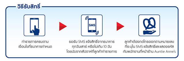 - ในทุกวันเสาร์ หรือไม่เกิน 10 วัน โดยนับจากสัปดาห์ที่ลูกค้าทำรายการ ธนาคารจะส่ง SMS แจ้งสิทธิ์ทาง sms ไปยังหมายเลขมือถือที่ใช้รับ SMS-OTP ในการรับ Premium Pretzel 1 ชิ้น สามารถเลือกรสชาติ Almond, Cinnamon หรือ Glazin Raisin พร้อม Lemonade 16 ออนซ์ 1 แก้ว ที่ Auntie Anne's (ทุกสาขา ยกเว้นสนามบินสุวรรณภูมิ, สนามบินดอนเมือง, เมืองทองธานี, ไบเทค, ภูเก็ต, โลตัส สมุย และเซ็นทรัลเฟสติวัล สมุย) ให้กับลูกค้าที่ปฏิบัติ ตามเงื่อนไขข้างต้น