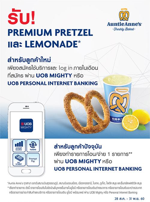 ลูกค้าธนาคารยูโอบี รับฟรี! Premium Pretzel และ Lemonade ที่ Auntie Anne's