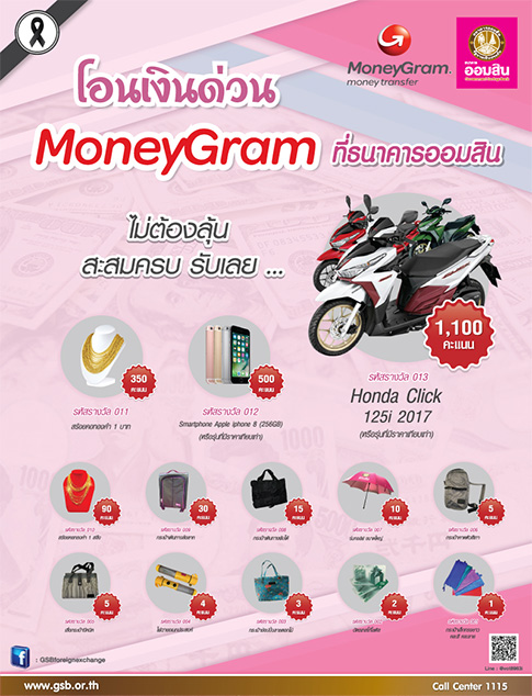 สำหรับลูกค้าที่โอนเงินด่วนผ่าน MoneyGram ที่ธนาคารออมสิน เพียงสะสมคะแนนครบ ไม่ต้องลุ้น รับเลยของรางวัลมากมาย