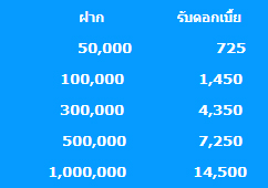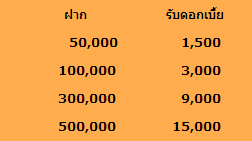 จำนวนเงินการฝาก และการจ่ายดอกเบี้ย - รับดอกเบี้ย ณ วันฝาก สำหรับยอดเงินฝากที่กำหนด ตั้งแต่ 50,000 บาท 100,000 บาท 300,000 บาท 500,000 บาท และ 1,000,000 บาท