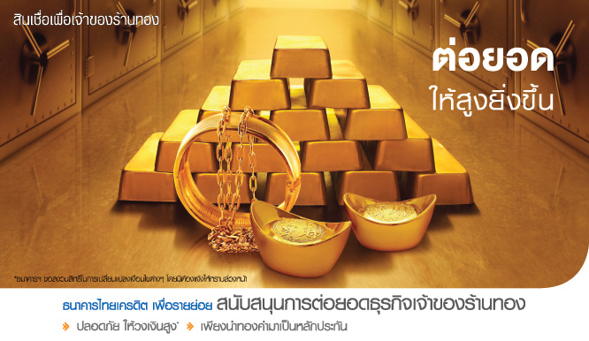 สินเชื่อสำหรับผู้ประกอบการกิจการร้านทองที่เป็นบุคคลธรรมดา หรือนิติบุคคล ที่มีประสบการณ์ในธุรกิจร้านทอง ต่อยอด ให้สูงยิ่งขึ้น เพียงคุณนำทองคำแท่งหรือทองรูปพรรณที่สะสมไว้มาเป็นหลักทรัพย์ค้ำประกันในการขอสินเชื่อกับธนาคาร เพื่อเพิ่มโอกาสในการดำเนินธุรกิจของคุณ ไม่ว่าจะเพิ่มเงินลงทุน เพิ่มผลกำไร หรือต่อยอดธุรกิจ