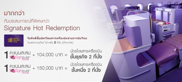- ใช้ 1 คะแนนสะสม Forever Rewards + เงิน 104,000 บาท เพื่อซื้อบัตรโดยสารเครื่องบินชั้นธุรกิจ 2 ที่นั่ง