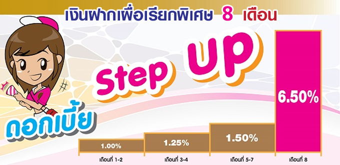 บัญชีเงินฝากเผื่อเรียกพิเศษ 8 เดือน เป็นบัญชีสำหรับลูกค้าบุคคลธรรมดา อายุตั้งแต่ 7 ปีบริบูรณ์ขึ้นไป และลูกค้านิติบุคคล เปิดบัญชีขั้นต่ำเพียง 10,000 บาท รับดอกเบี้ย Step Up สูงสุด 6.50% ต่อปี