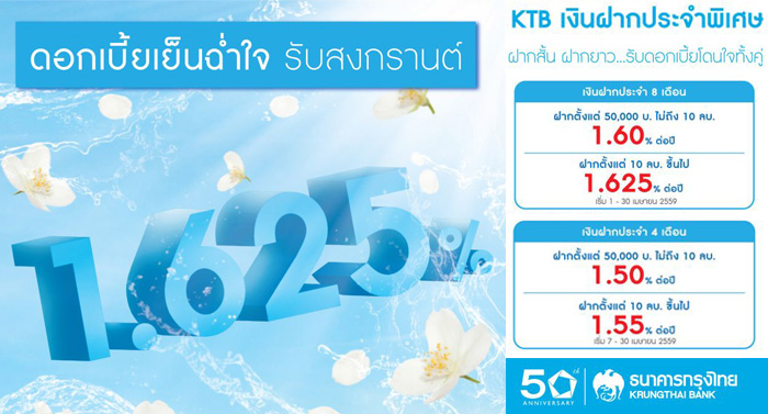 บัญชีเงินฝากประจำพิเศษ ระยะเวลาฝาก 4 เดือน และ 8 เดือน ดอกเบี้ยเย็นฉ่ำใจรับเทศกาลสงกรานต์ อัตราดอกเบี้ยสูงสุด 1.625% ต่อปี